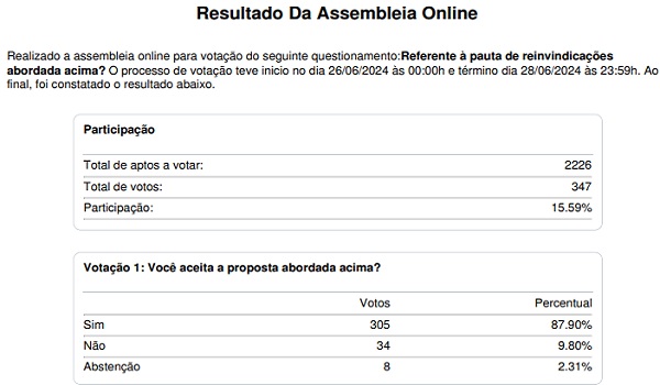 A proposta de Pauta de Reivindicações para o Acordo Coletivo de Trabalho 2024/2025, com a Funcamp foi aprovada por 87%,90 dos votos. Foram 305 votos a favor da proposta de Pauta de Reivindicações, 34 votos contrários e 8 abstenções, de um total de 347 votantes.