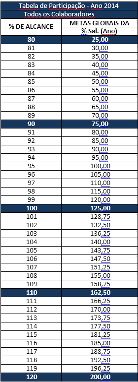 A empresa concederá, anualmente, a todos os seus Funcionários uma Participação por Resultados Globais da EMPRESA, de até 2 (dois) salários nominais mensais, progressivamente a partir do alcance de, no mínimo, 80% (oitenta por cento) até 120% (cento e vinte por cento) do resultado do conjunto de todos os seus indicadores e Metas Globais anuais. Os valores desta Participação serão de acordo com a tabela específica (Anexo I).