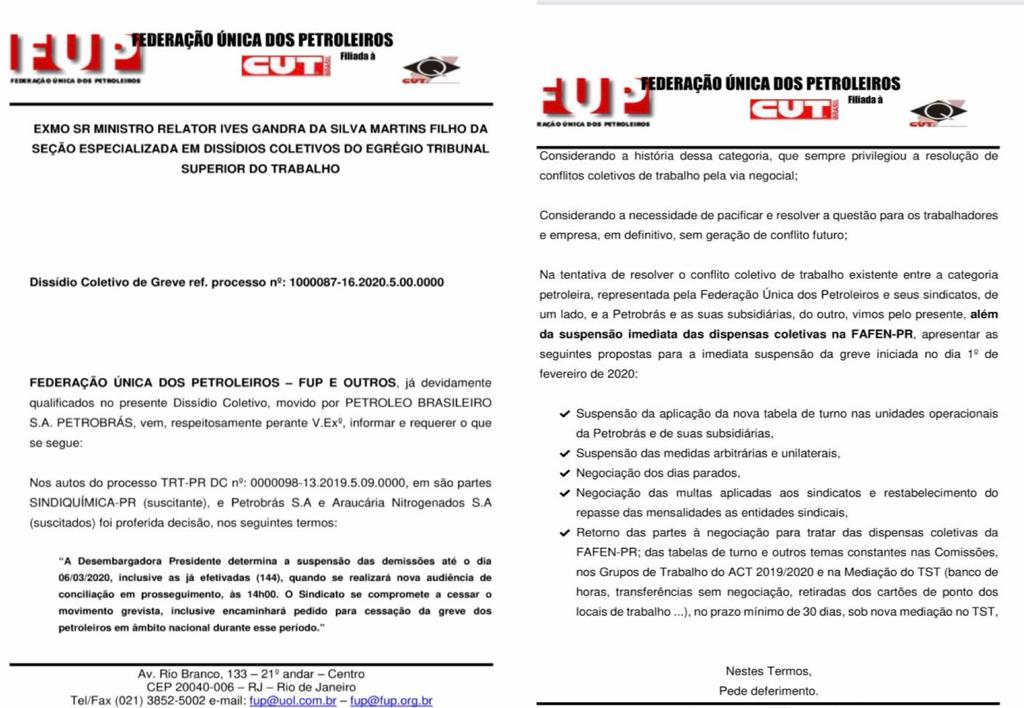 No encontro desta terça com o ministro do TST, foi reforçada a importância da abertura de um canal de negociação para solução do impasse criado pela Petrobrás, que resultou na greve dos petroleiros, que já atravessa a terceira semana. Após a reunião com Ivis Gandra, a FUP protocolou uma petição nos autos do processo, formalizando o pedido de abertura de negociação para tratar de todo os fatos que envolvem o conflito da greve, inclusive as demissões na Fábrica de Fertilizantes Nitrogenados do Paraná (Fafen).