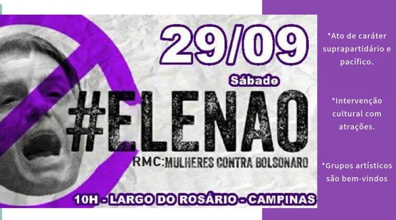 O ato suprapartidário das mulheres contra o candidato de extrema-direita, Jair Bolsonaro (PSL), acontecerá em Campinas, no próximo sábado, dia 29, às 10 horas da manhã. Os manifestantes vão se concentrar no Largo do Rosário, região central.