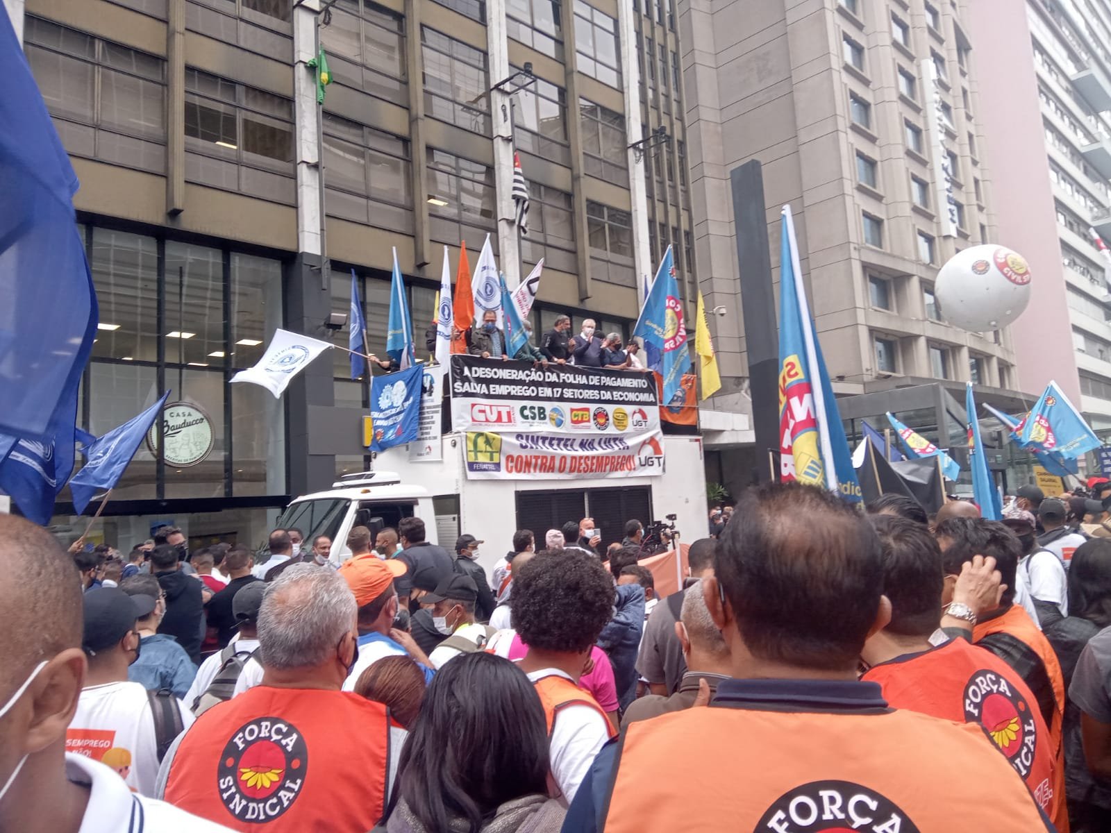 Em busca de preservar empregos em 17 setores, sindicalistas das centrais sindicais fizeram ato, na tarde desta segunda-feira (25), em frente a sede do governo federal, na Avenida Paulista, em São Paulo. Participaram trabalhadores da Força Sindical, CUT, UGT, CTB, CSB e Nova Central.