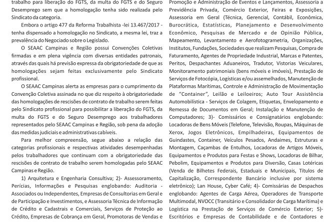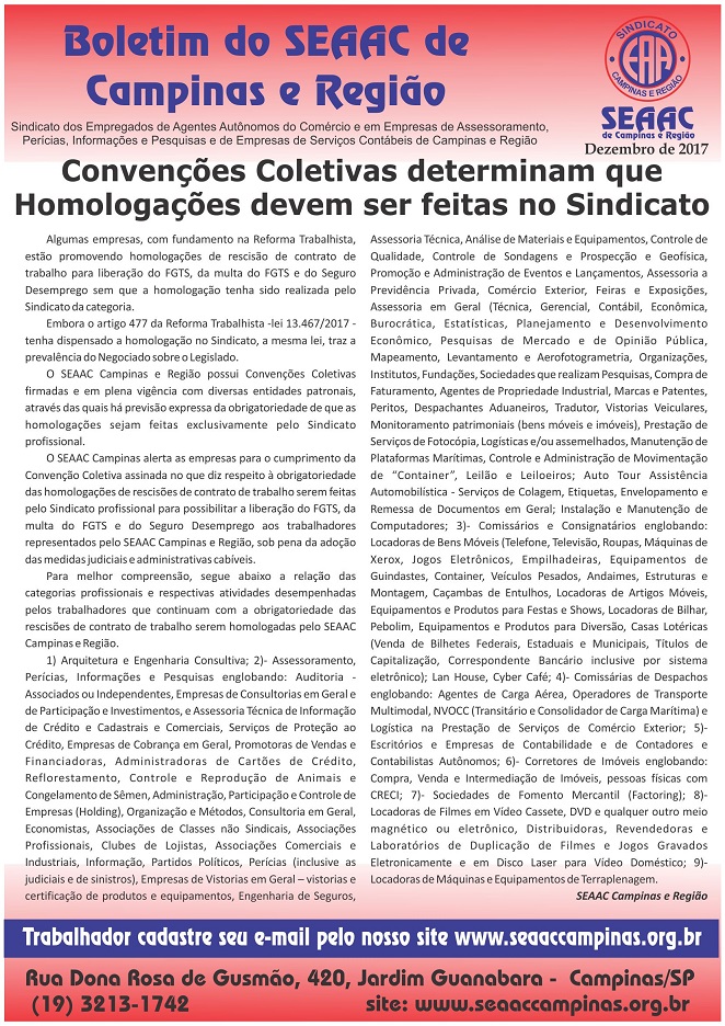 O SEAAC Campinas alerta as empresas para o cumprimento da Convenção Coletiva assinada no que diz respeito a obrigatoriedade das homologações de rescisões de contrato de trabalho serem feitas pelo Sindicato profissional para possibilitar a liberação do FGTS, da multa do FGTS e do Seguro Desemprego aos trabalhadores representados pelo SEAAC Campinas e Região, sob pena da adoção das medidas judiciais e administrativas cabíveis.