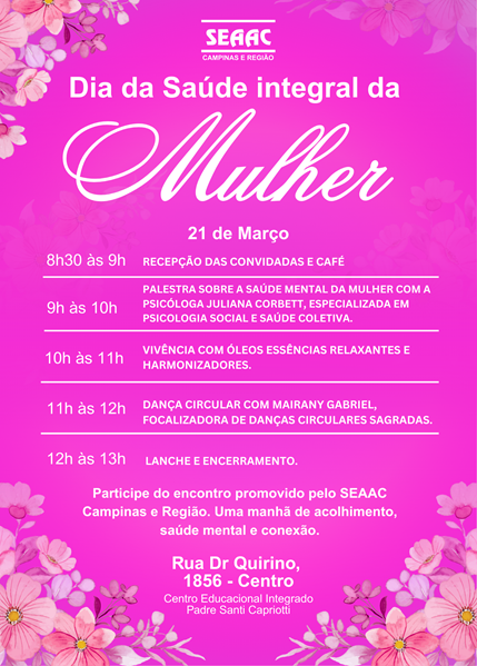 Em comemoração ao Mês da Mulher, o SEAAC Campinas e Região programou uma manhã de sábado para discutir e viver um Dia da Saúde integral da Mulher. O encontro vai ser no sábado, dia 21 de março, das 8h30 às 13 horas, no Centro Educacional Integrado Padre Santi Capriotti, e vai contar com palestra sobre a saúde mental da mulher, com a psicóloga Juliana Corbett, especializada em Psicologia Social e Saúde Coletiva, Dança Circular, com Mairany Gabriel, focalizadora de Danças Circulares Sagradas e uma vivência com óleos essenciais, com a Psicoaromaterapeuta, Valéria Salek, além de um lanche no encerramento.