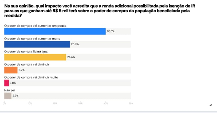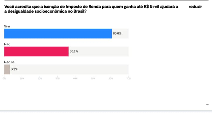 Ainda sobre o IR, a maioria da população (60,6%) acredita que a isenção vai melhorar a economia e reduzir a desigualdade social e  melhorar o poder de compra.