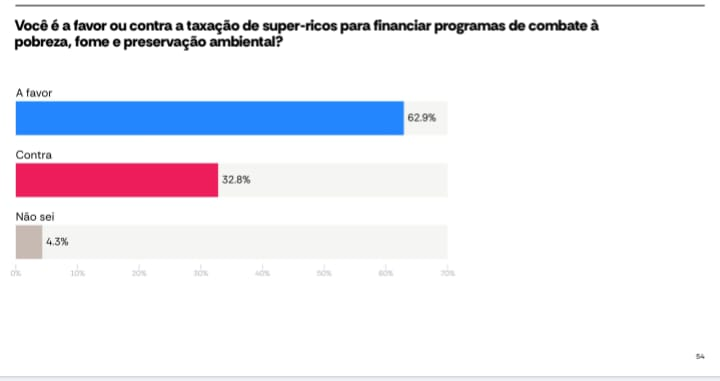 62,9% aprovam a taxação de super-ricos para financiar programas de combate à pobreza, fome e preservação ambiental