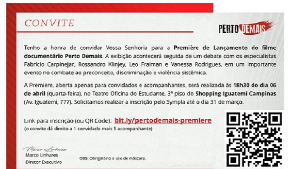 Os associados e associadas do SEAAC Campinas e Região podem se inscrever para assistir à Premiere e debate do filme “Perto Demais”. É preciso se inscrever no site do Sympla até o dia 31 de março ara ter direito a um ingresso com direito a acompanhante. O link para a inscrição é: bit.ly/pertodemais-premiere.
