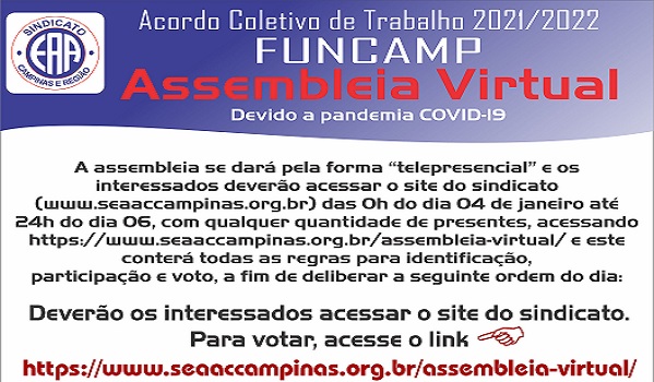 Trabalhadoras e Trabalhadores da Funcamp, a proposta do Acordo Coletivo de Trabalho 2021/22, data base de 1º de agosto de 2021, está sendo votada virtualmente. A votação na proposta de acordo ficará aberta 23h59min do dia 6 de janeiro. O link para entrar na área restrita é https://votacaoweb.diretasistemas.com.br/site/login?votacao=97c2c177b71abb43b37ca573ab6cc2ee.
