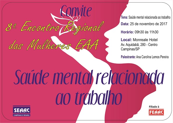 O SEAAC Campinas e Região realizará neste sábado, dia 25 de novembro o seu 8º Encontro Regional da Mulher das categorias dos Agentes Autônomos do Comércio de Campinas e Região. Sob a cordenação da secretária da Mulher da FEAAC, e presidente do SEAAC Campinas e Região, Elizabete Prataviera, o evento e terá como tema: “Saúde mental relacionada ao trabalho”. A convidada para dar a palestra é a psicóloga Ana Carolina Lemos Pereira.