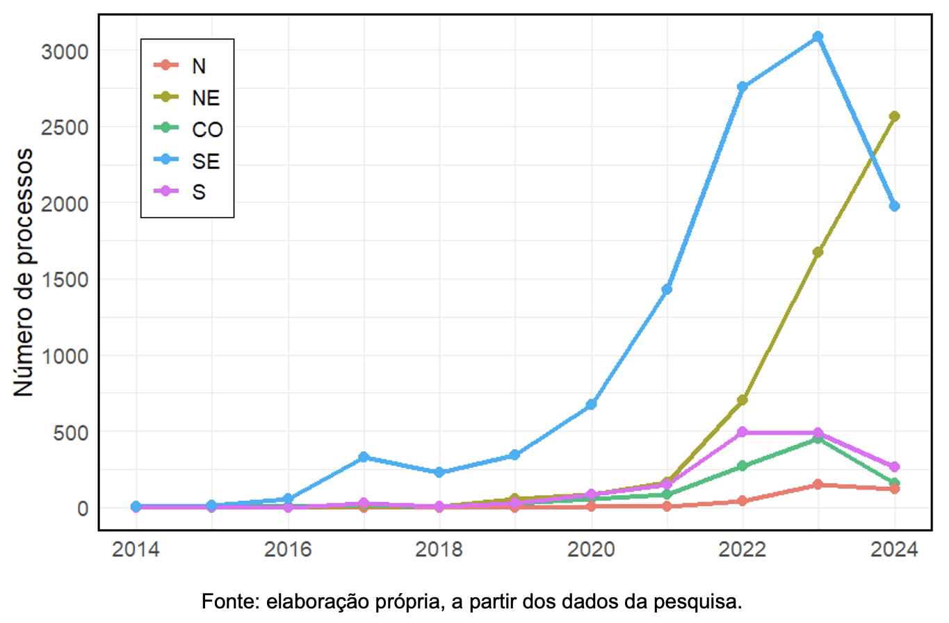 Os resultados apontam que a região Sudeste é o epicentro dessa batalha judicial. Com um crescimento acentuado a partir de 2020, a região chegou a concentrar mais da metade de todas as ações ajuizadas contra a Uber. A Figura 1 ilustra a quantidade de processos contra a Uber por região entre 2014 e 2024.