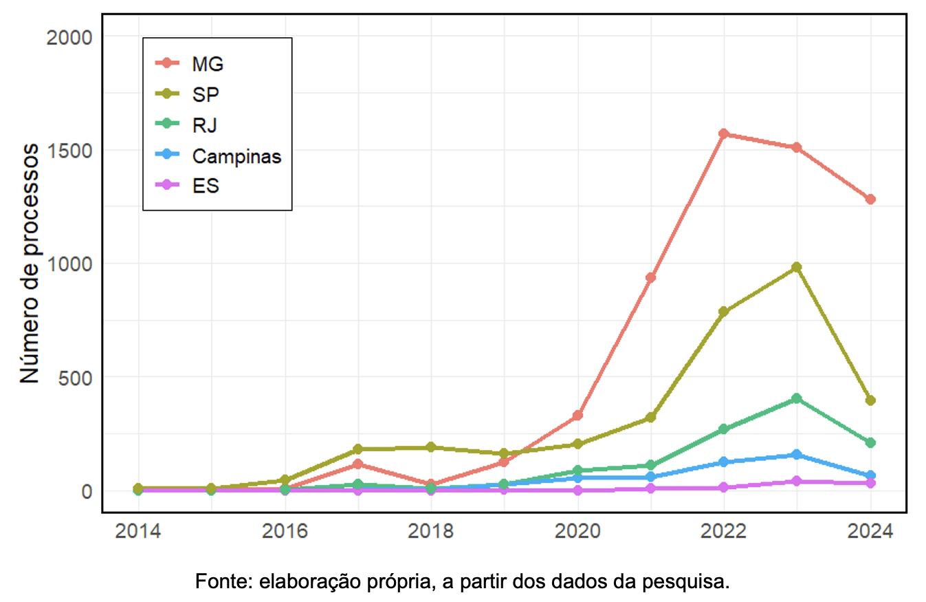 Dentro do Sudeste, Minas Gerais e São Paulo se destacam, com um aumento expressivo de processos contra a Uber a partir de 2021, conforme ilustra a Figura 2. Curiosamente, Minas Gerais ultrapassou São Paulo em número de ações a partir de 2020, indicando uma possível atuação mais forte de assessorias jurídicas especializadas no estado.