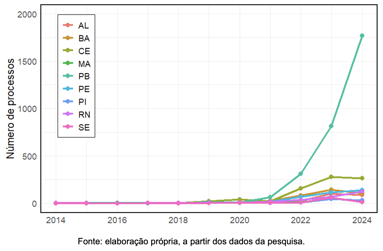 Não se descarta que o crescimento acentuado da litigância contra a Uber, a partir de 2020, possa estar relacionado com o início da mobilização coletiva da categoria dos trabalhadores de plataforma, concretizada a partir da organização do “Breque dos Apps”, ocorrida em julho do citado ano (Machado et al, 2022). O comportamento da PB merece um estudo de caso pois destoa significativamente das demais unidades da federação.