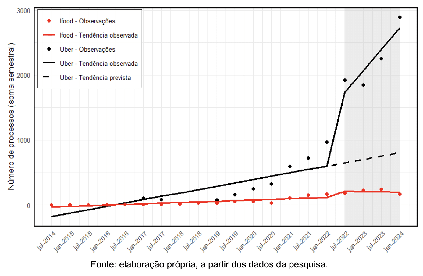 Vamos entender a Figura 4. As bolinhas representam a quantidade semestral de ações trabalhistas ajuizadas: as pretas correspondem às ações propostas contra a Uber; as vermelhas, contra o iFood. Para cada empresa, foi observada a tendência no ajuizamento de ações trabalhistas ao longo dos anos (linhas preenchidas em preto e vermelho).