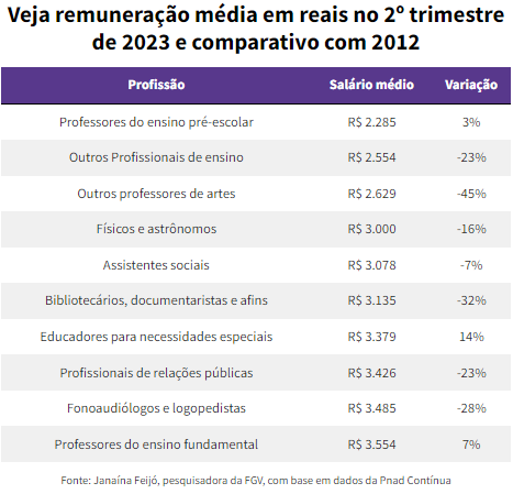 Professores de educação infantil recebem o salário médio mais baixo entre todos os profissionais com ensino superior no Brasil. A remuneração média real da categoria é de R$ 2.285, ou seja, menos de dois salários mínimos (R$ 2.640), segundo pesquisa do Ibre/FGV.