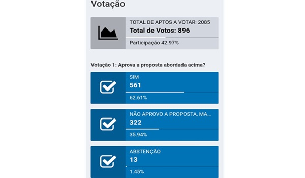 O comparecimento à votação foi elevado: 42.97% das(os) trabalhadoras(es) aptas(os) a votar, participaram da consulta à categoria.